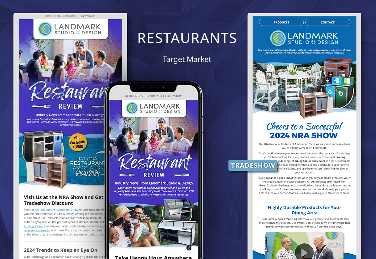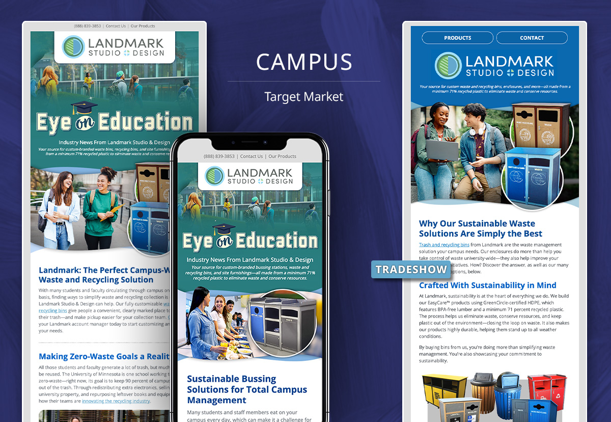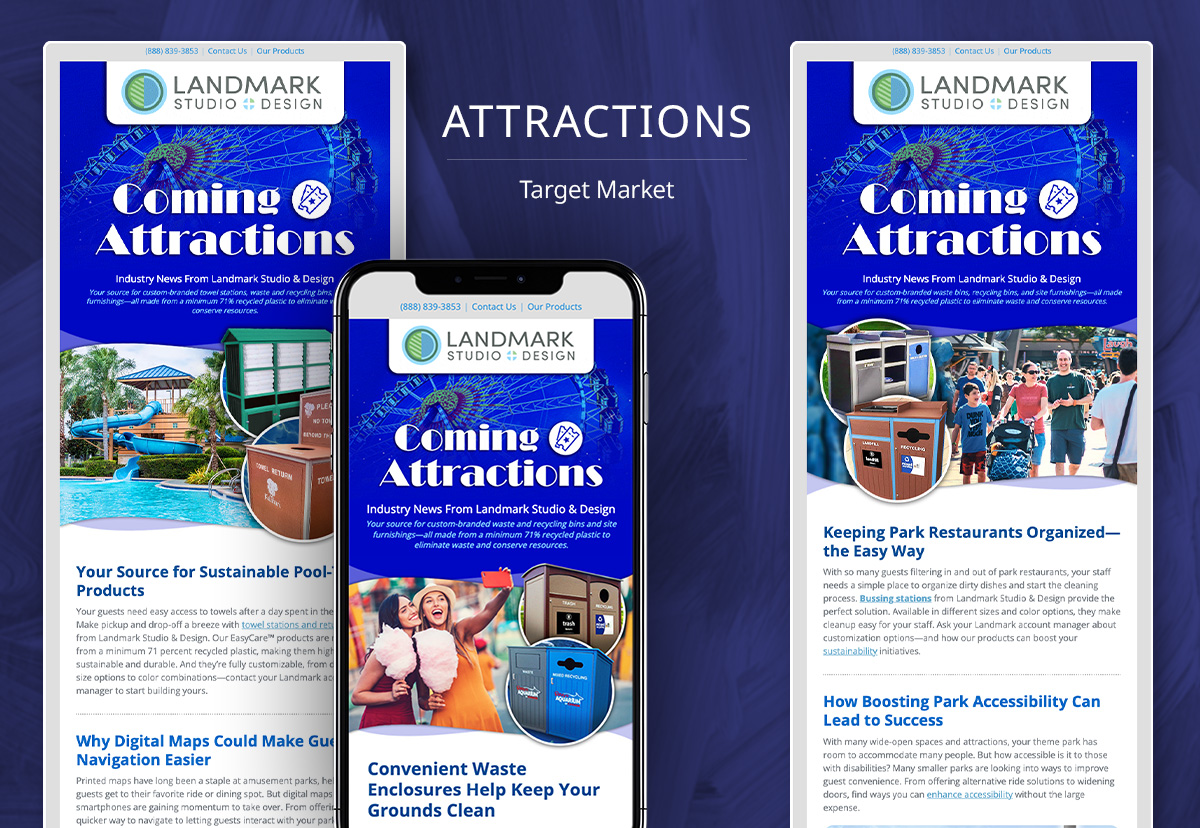 A key feature of the campaign was the creation of versatile monthly marketing emails tailored to different market segments, including golf courses, college campuses, municipalities, public parks, restaurants, and amusement parks. Each email featured industry-specific articles and news, positioning Landmark Studio & Design as a knowledgeable authority in their field. Additionally, we highlighted Landmark products, such as customizable furniture and waste bins made from recycled plastic, showcasing their versatility for both indoor and outdoor use.