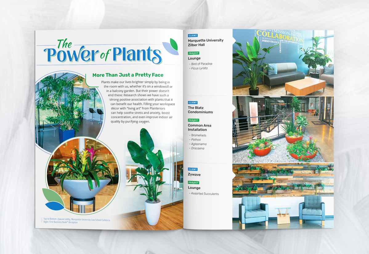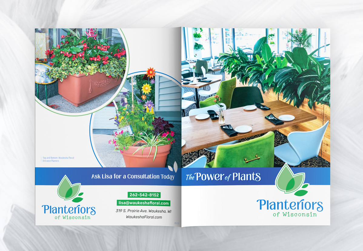 The goal of this project was to educate readers about the importance of indoor plants in workspaces and connect them with Planteriors of Wisconsin, a division of Waukesha Floral and Greenhouse. The brochure aimed to showcase the benefits of plants in enhancing work environments and highlight the company’s expertise in plant installation and maintenance.