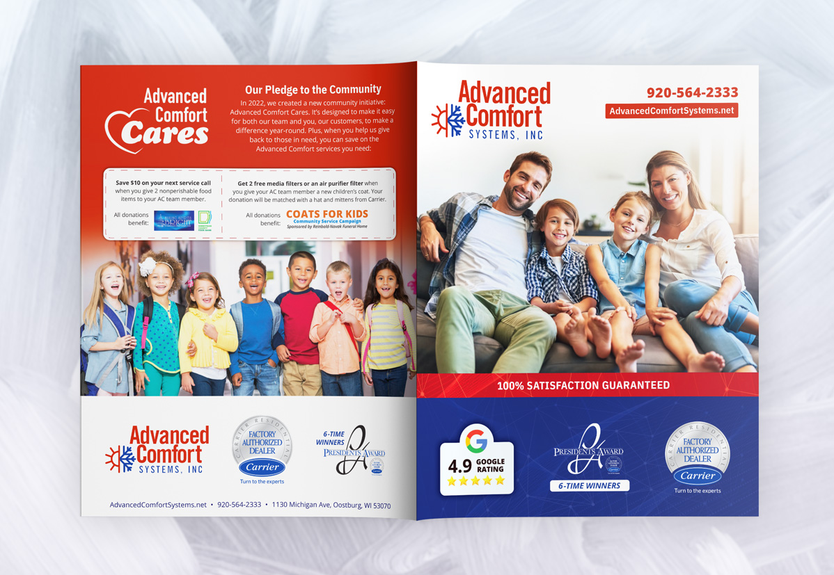 The objective of this project was to connect customers with Advanced Comfort Systems Inc.’s award-winning heating, cooling, and indoor air quality services, as well as their experienced staff. The brochure aimed to showcase the company’s expertise and wide range of services while highlighting their charity program, “Advanced Comfort Cares.”